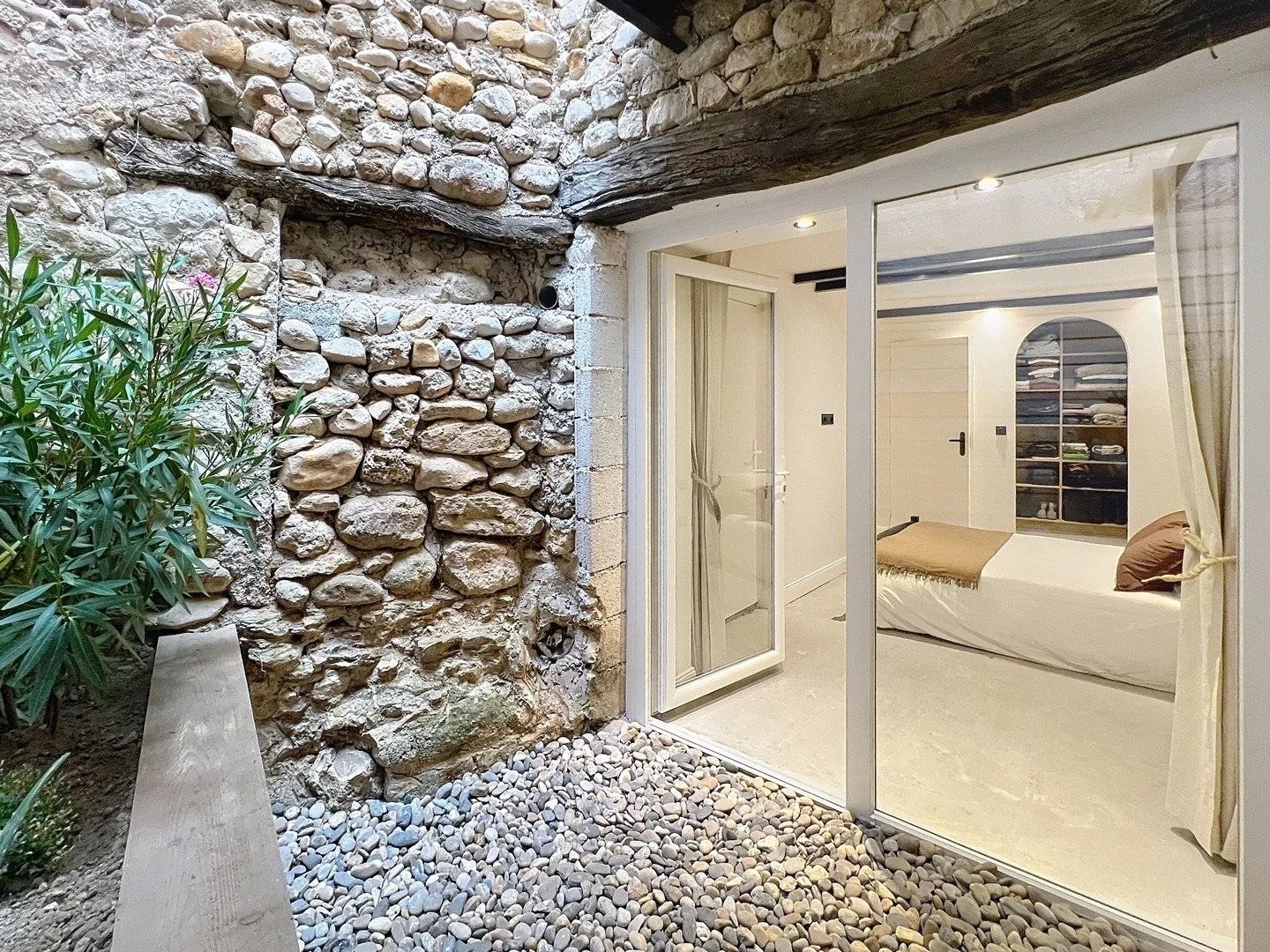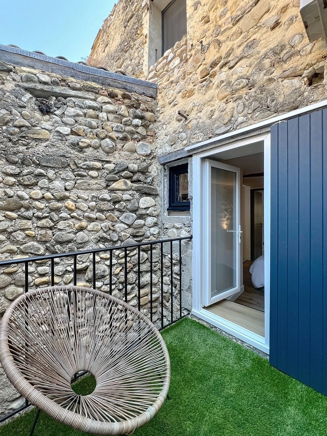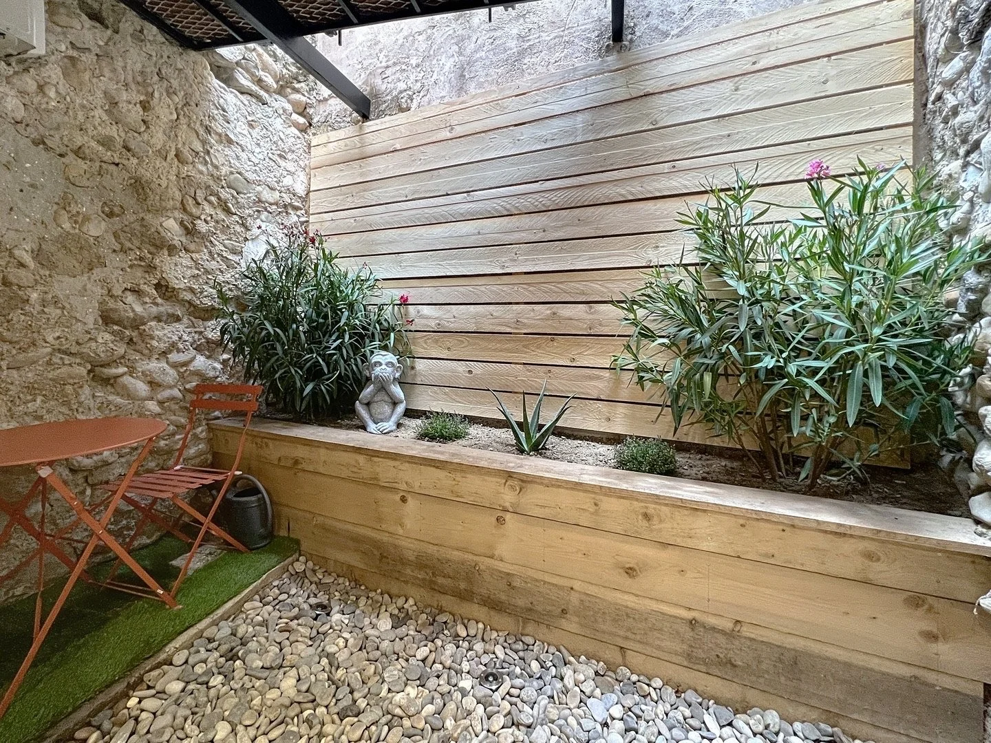 Une cour intime en pierre de 7 m², parfaite pour un petit déjeuner, complète l’ensemble, avec un coin buanderie pratique et un vaste rangement.