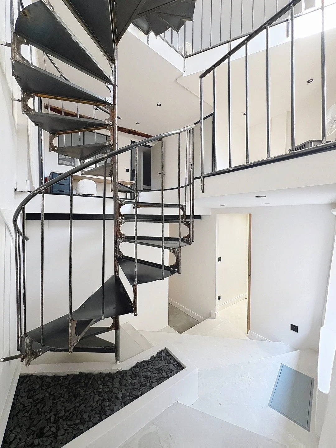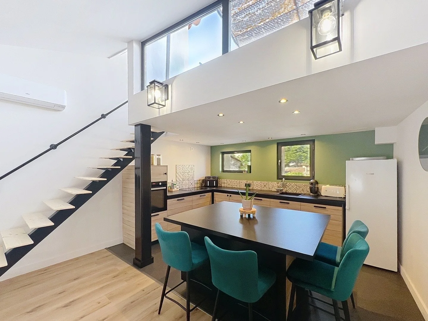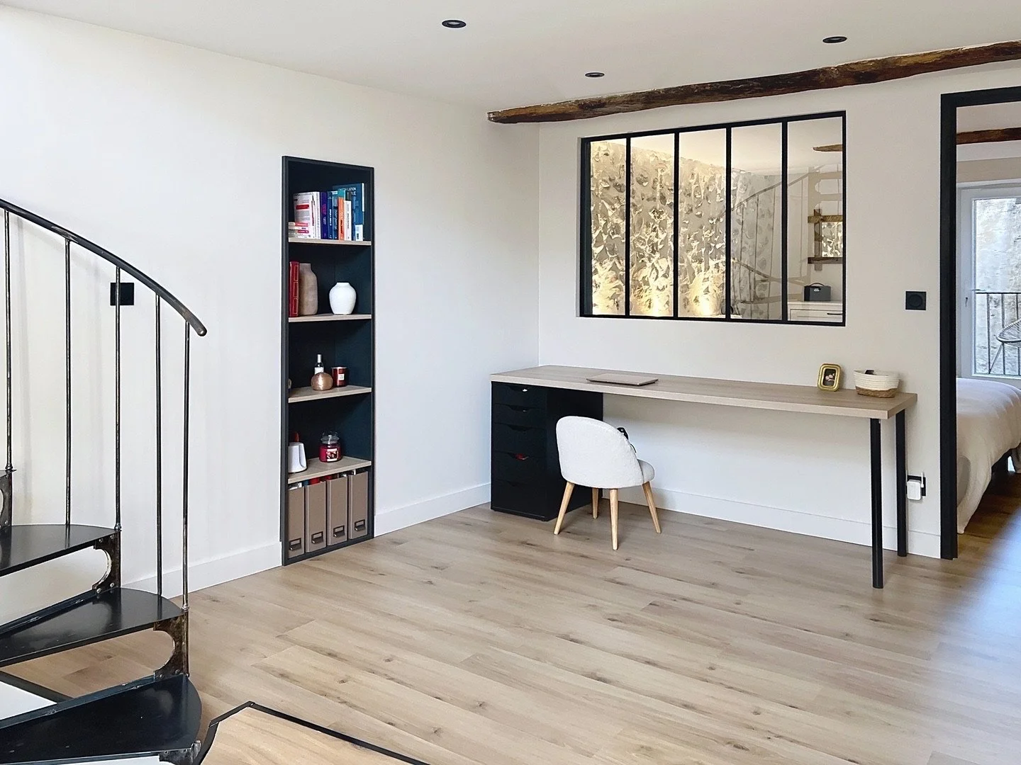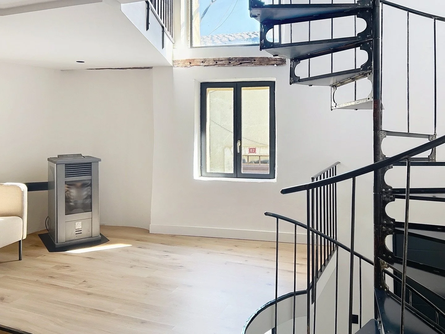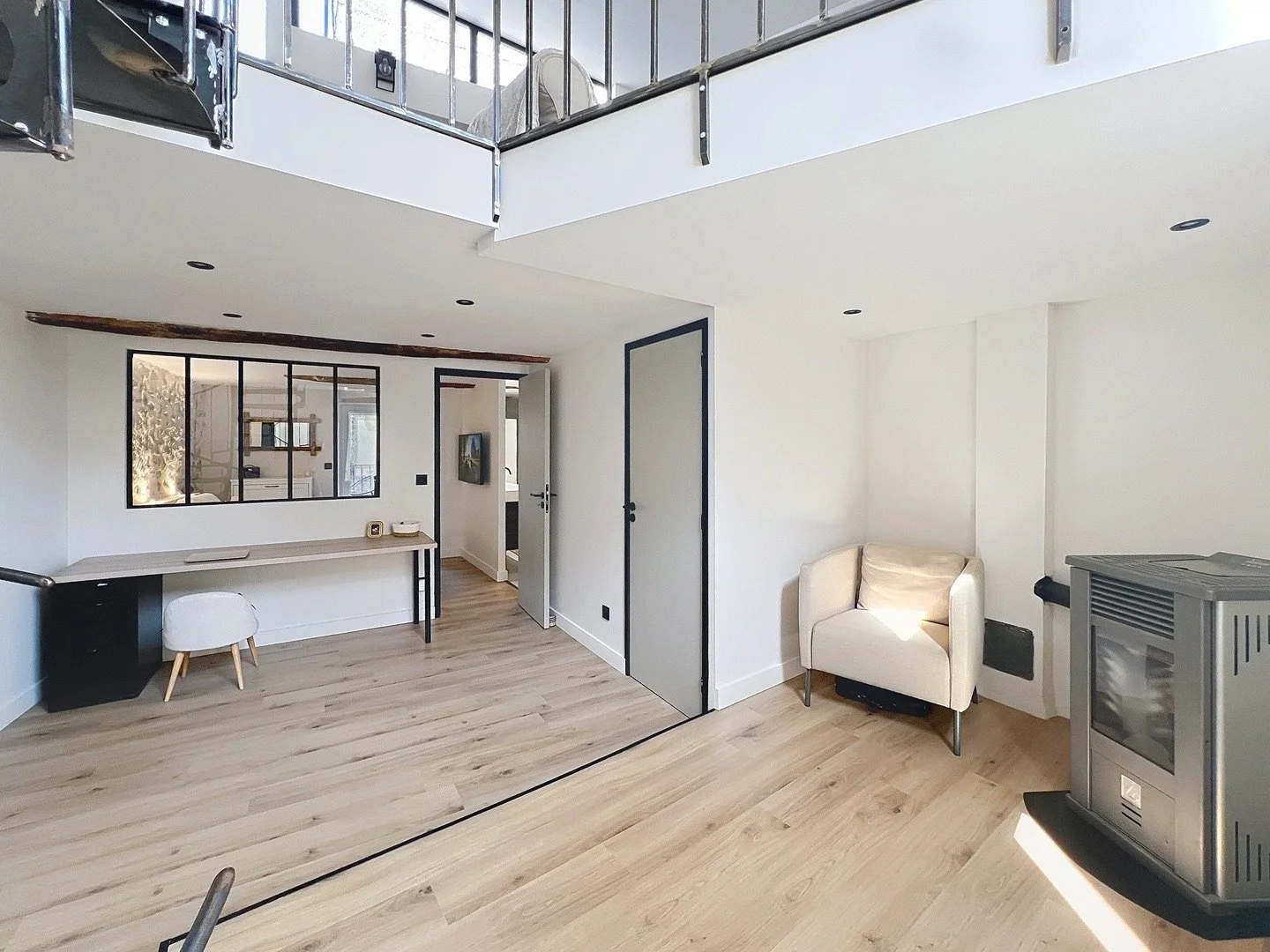 Un somptueux escalier en fer forgé sur mesure mène à un espace bibliothèque / bureau baigné de lumière, chauffé par un poêle à granulés.