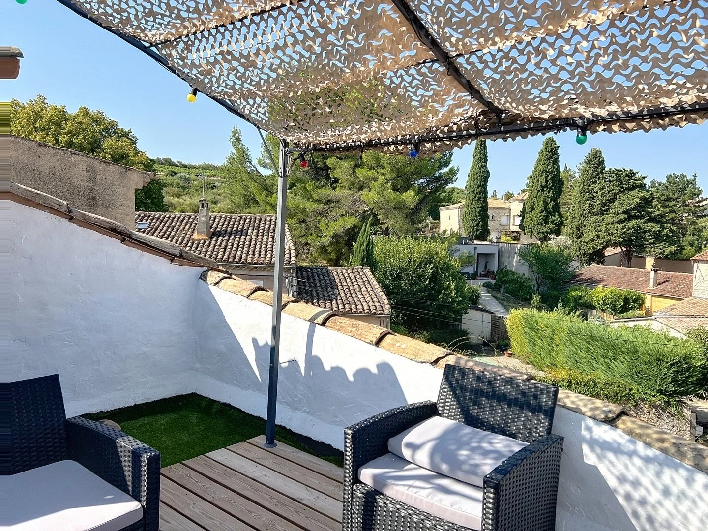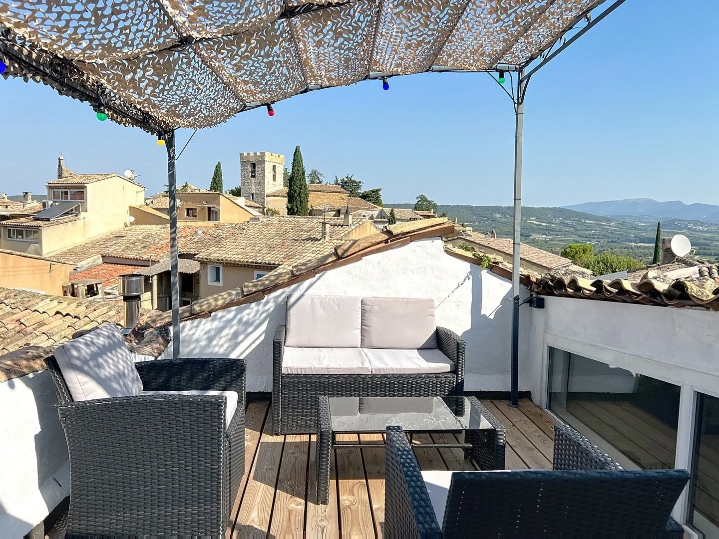 Le point d'orgue des lieux : une terrasse panoramique de 20 m² , belvédère d'exception, offre une vue à 360° sur le village, les collines et les vignobles. Un lieu magique pour admirer les couchers de soleil ou siroter un verre de rosé en été.