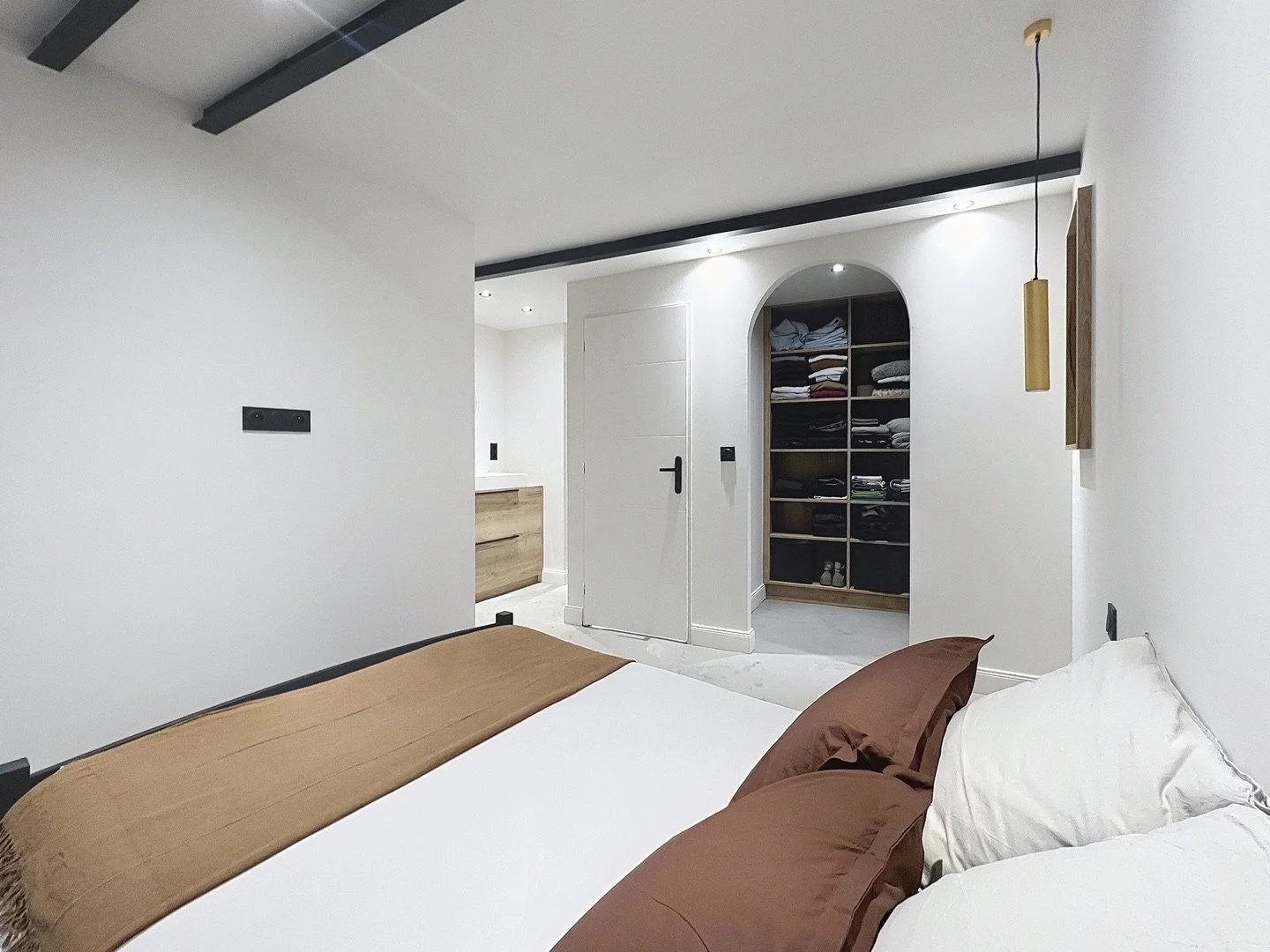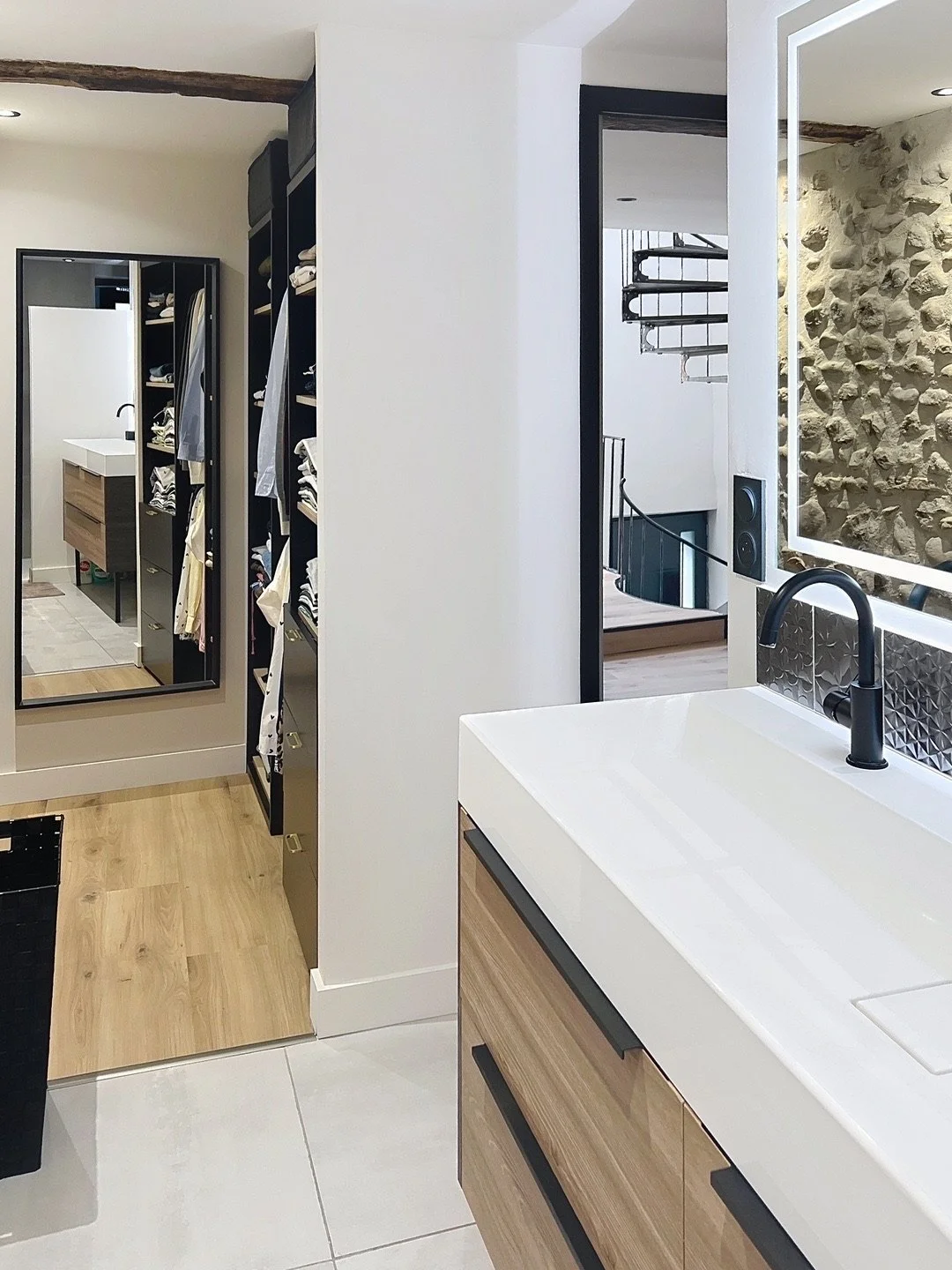 Cet espace indépendant comprend une chambre, un dressing ainsi qu'une pièce avec double-vasque et meuble, pouvant accueillir une douche ou des WC.
